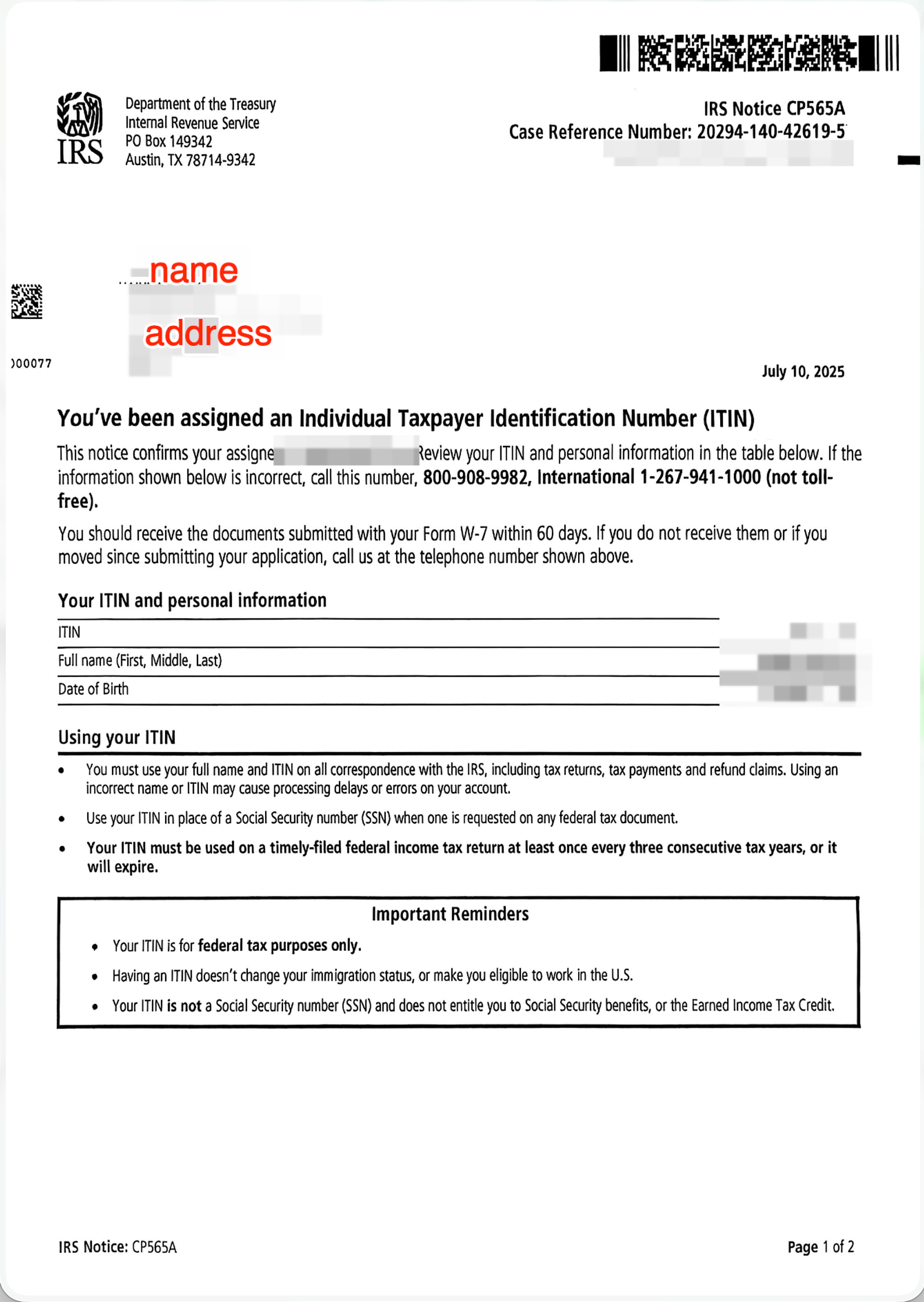 - Or the address that was originally used for the ITIN notice letter